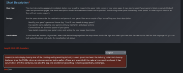 💡 Tip pro profíky: Krátký popis (short description) na Steamu udržujte pod 300 znaky, pro jistotu ideálně kolem 290, jinak riskujete useknutí nejdůležitějšího háčku. U ostatních krátkých částí (nadpisy, odrážky) počítejte s tím, že se text v některých jazycích natáhne. Pokud je někde omezení místa kritické, ujasněte si to předem.